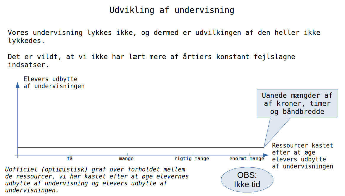 En af de vilde erkendelser, som vi sjældent taler om, er, at vi har kastet uanede mængder af ressourcer efter at øge eleverne udbytte af undervisningen, uden at det har hjulpet. Elever i dag er ikke et hak dygtigere end før vi satte de sidste årtiers små, store og enotme tiltag i søen.